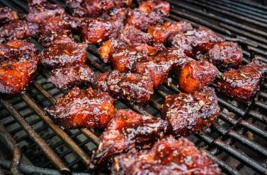 Zet de schaal nog één keer op de BBQ, voor ongeveer 20 minuten, zodat de saus lekker kan karameliseren. Serveer de Pork Belly Burnt Ends vervolgens direct, met wat prikkertjes om ze uit de schaal te prikken.